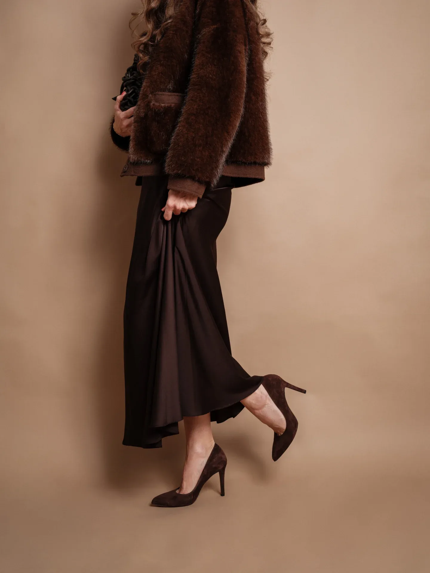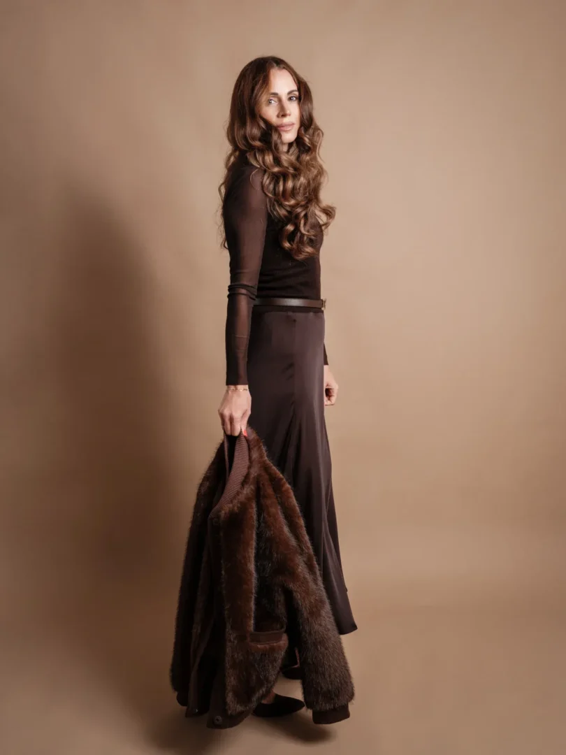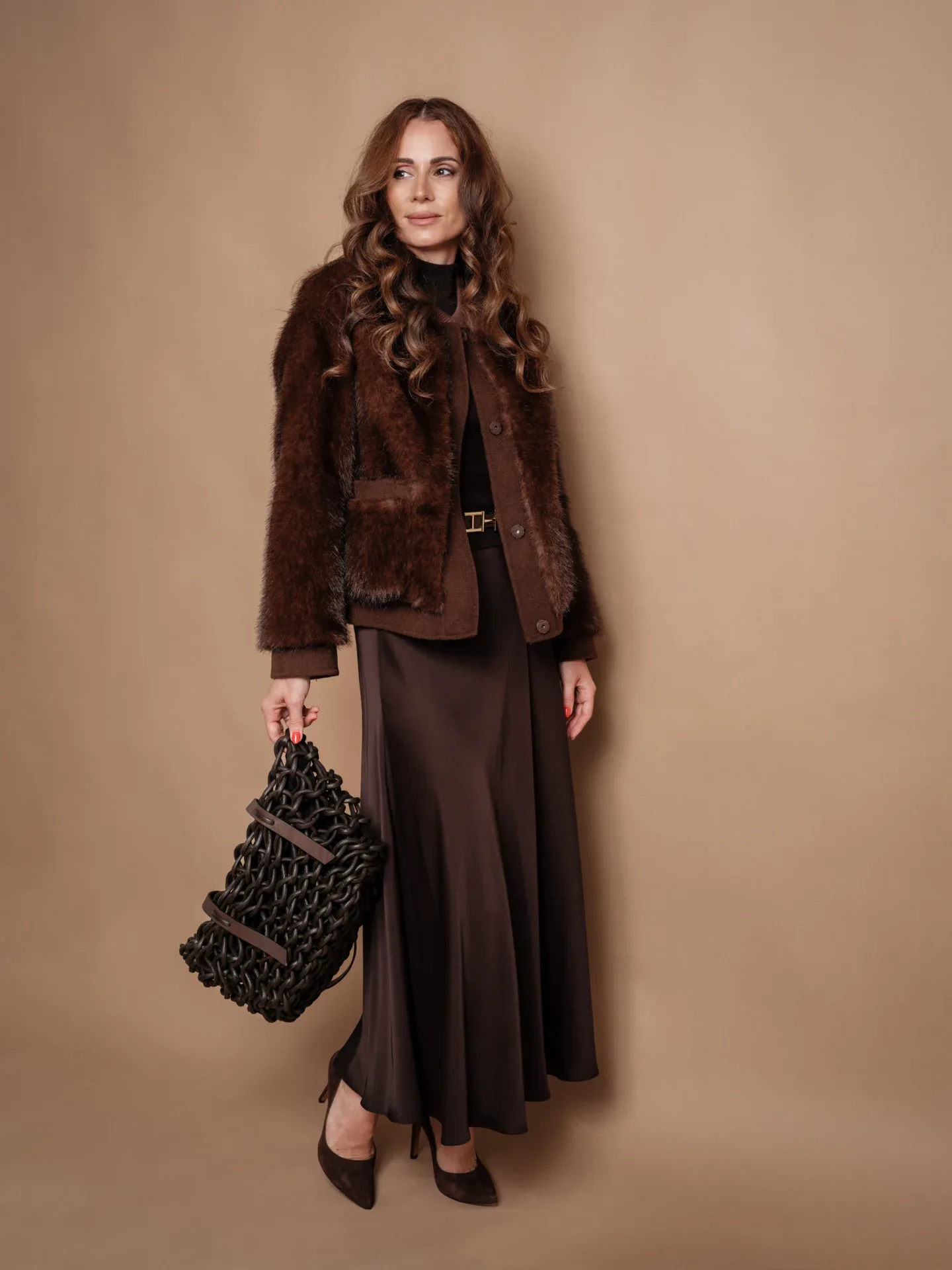 Ein Look voller Eleganz: Fließender Maxi-Rock, tailliert mit Statement-Gürtel und kombiniert mit einem schlichten Oberteil. Highlight: Der Rock lässt sich nicht nur als Rock, sondernauch als Bandeau-Kleid stylen –ein Piece, zwei Looks. Die Fake-Fur-Jacke bringt Wärme und Luxus in den Style, während Heels den femininen Twist setzen. Ein Outfit, das zeitlose Klasse und Vielseitigkeit vereint –von Dinner bis Event.