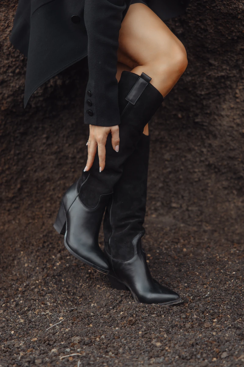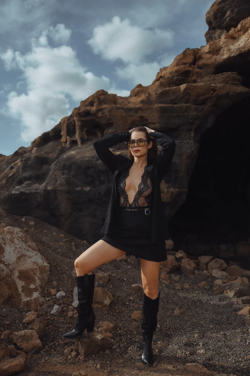 Dieses Outfit ist die ideale Wahl für die Feiertage, wenn Eleganz mit einer rebellischen Note kombiniert werden soll. Der zarte Spitzenbody harmoniert perfekt mit dem geradlinigen Blazer und den rockigen Lederstiefeln, was für unvergessliche Weihnachts- und Silvesterpartys sorgt. Die rauen Felsen im Hintergrund betonen die Stärke und Unabhängigkeit dieses Looks, der die festliche Jahreszeit aufregend und stilvoll feiert.
